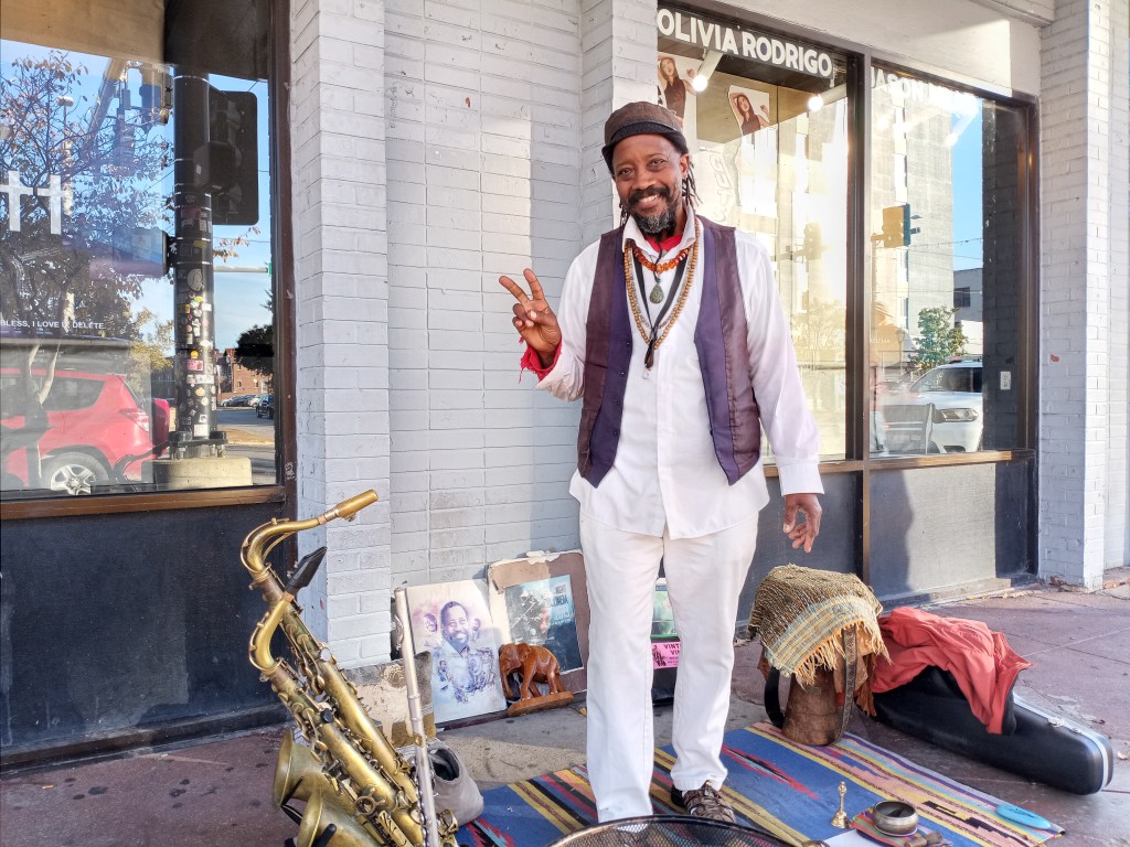 Outside of Vintage Vinyl i met a person who is a deep part of the fabric of St. Louis; a very kind man with a set of saxophones named Raven Wolf Jennings. Jazz is my favorite music in the whole entire world, so anyone playing it will always grab my attention. His mission is in playing ‘Spiritual Jazz …in the St. Louis Tradition’. As much as i am a fan of noise, i am also a fan of the sparse, peaceful and meditative. We were en route to go to see Metallica; if there was a bit more time i would have loved to have sat and had a conversation with him.