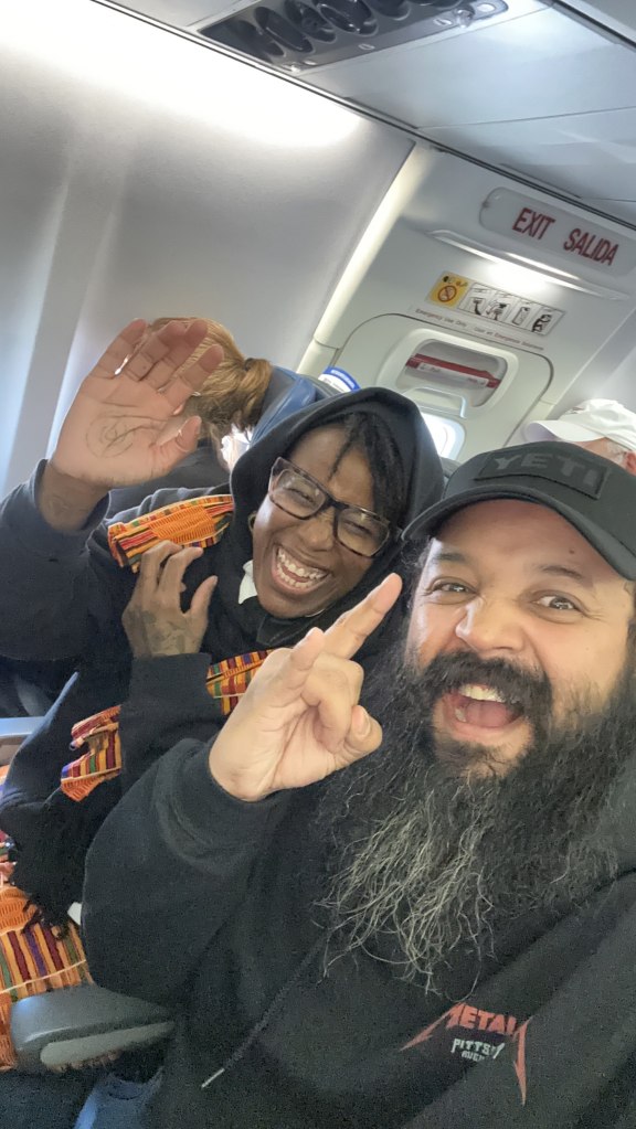 My body’s clock is interesting, because i tend to fall asleep immediately after takeoff (and right after the safety and emergency protocols), and i wake up right before the landing announcement. i tend to get very little rest before flying, so that nap is something i always look forward to. Prior to this flight to St. Louis i took a very brief 20-30 minute nap (in the wheelchair as i was preparing to pack); however, i had a tiny jolt of energy upon meeting Julian, who was also going to see the band.